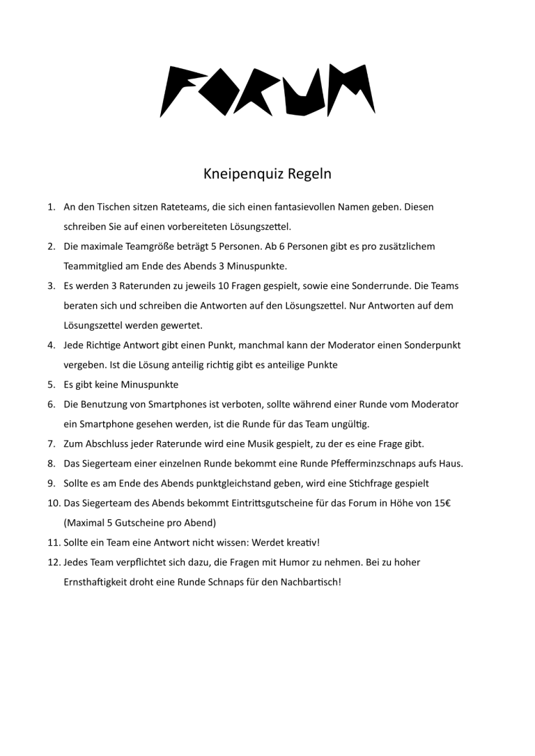 An jedem letzten Freitag des Monats treffen sich Ratewillige und Neugierige, um sich in kleinen Teams den Fragen zu stellen. In drei Runden á 10 Fragen geht es um Wissen in Geschichte, Politik, Kultur, Unterhaltung, Geographie oder unnützes Wissen. Die vierte Runde ist eine Überraschungsrunde der Moderatorin oder des Moderators.