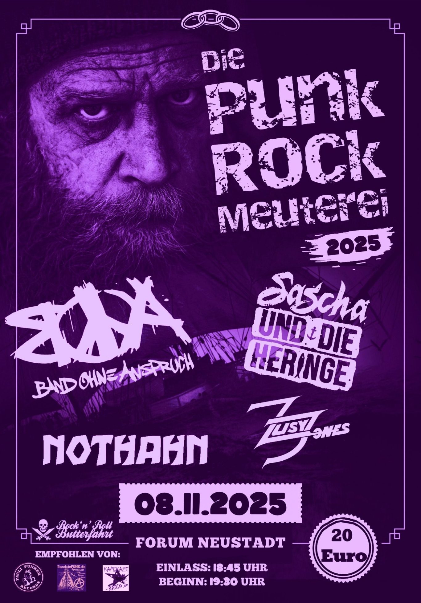 Am Samstag, den 08.11.2025 findet zum 9. Mal die Punkrock Meuterei in der Kulturwerkstatt Forum statt. Dieses Jahr spielen 4 phantastische Bands bei uns. Den Anfang macht Zusy Jones aus Oldenburg in Holstein. Die Band spielt schnörkellosen Punkrock mit deutschen Texten in ihrer unvergleichlichen Art. Danach spielen Nothan aus Weddingstedt. Ebenfall Punkrock, ebenfalls auf deutsch. Ihr Sänger Eddi begleitet mit seinem Arkkordeon. Positiv, witzig und ausgelassen. Weiter spielen Sascha und die Heringe. Die vier Bandmitglieder kommen aus Emden und stehen für Spaß, Punkrockparty und ausgelassener Stimmung. Zum Schluß spielen Band ohne Anspruch. Sicherlich eine der meist unterschätzten Bands in Deutschland. Ihr Sänger Olli Bockmist war einer von den Abstürzenden Brieftauben. Er selber schreibt und komponiert für namenhafte Größen in Deutschland. Mit seiner eigenen Band sorgt er für einen grandiosen Punkrockabend, an den wir uns noch lange erinnern werden.